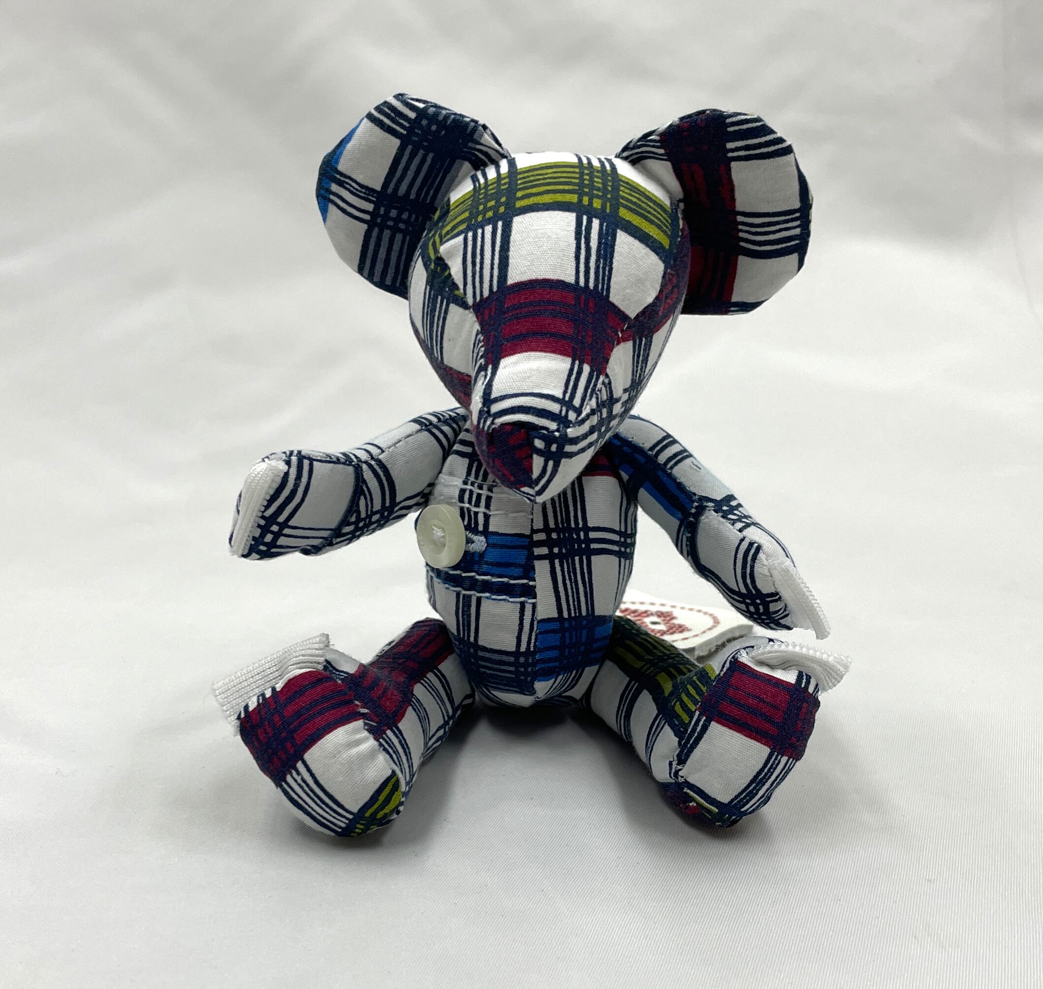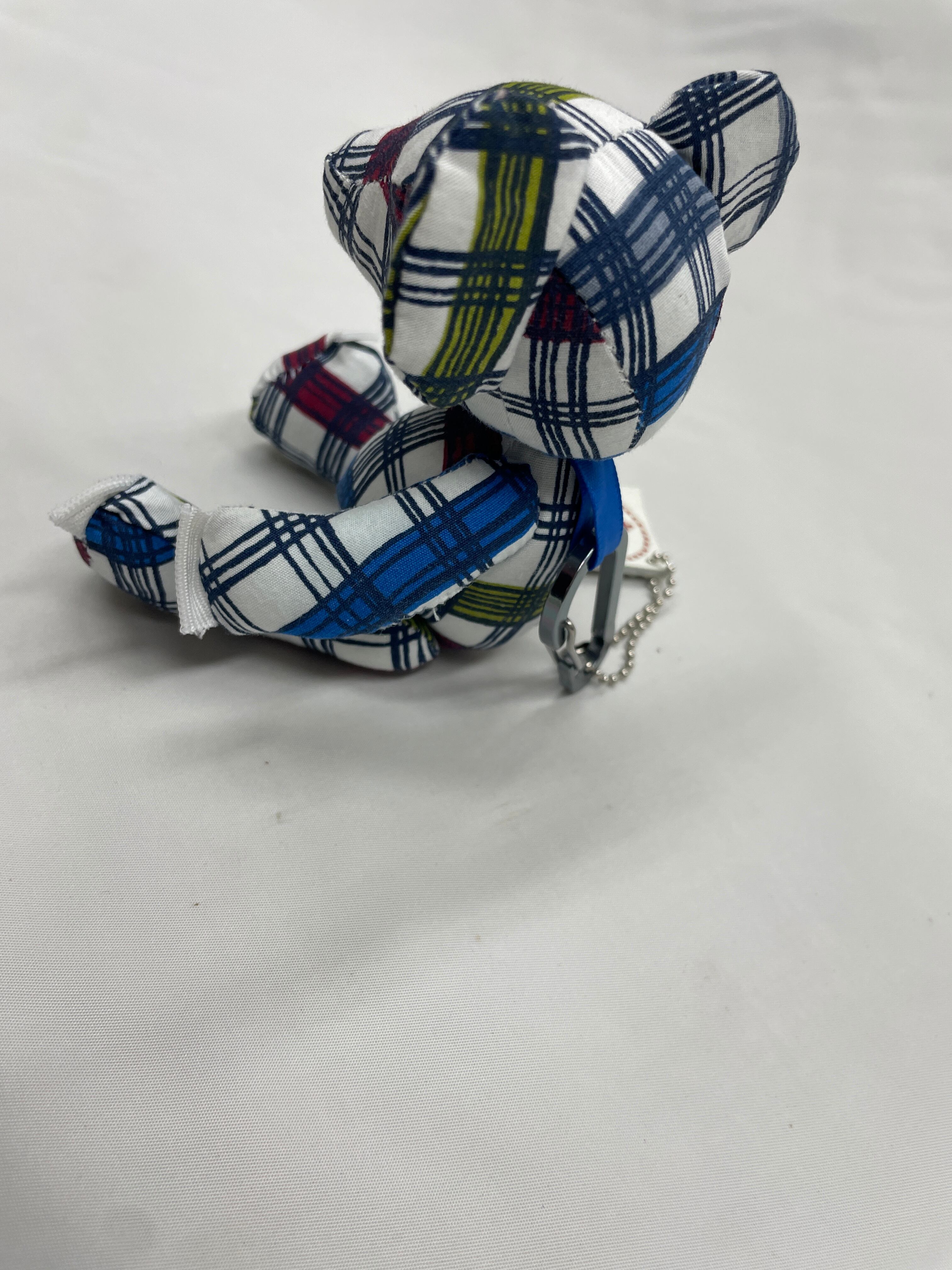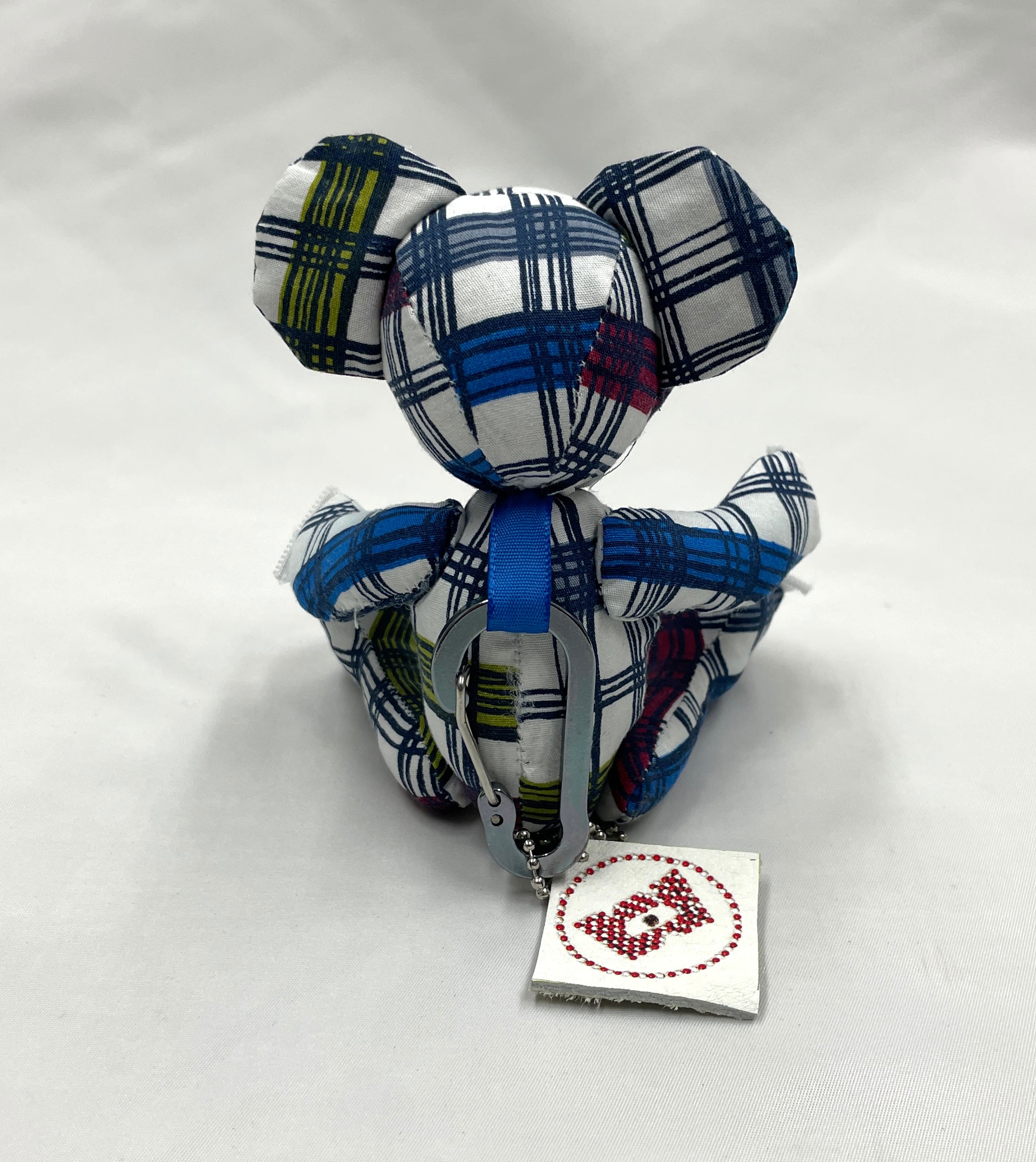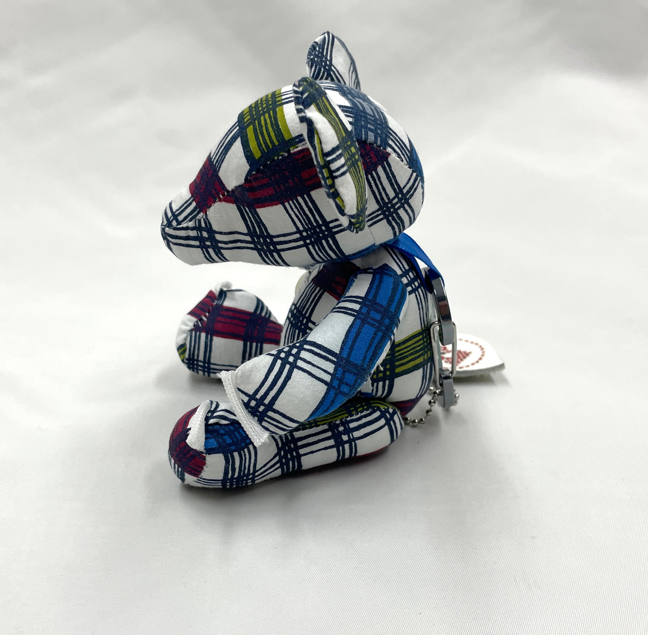 子供服のチェック柄シャツの生地を使用して作成した、ユニークなテディベアのキーホルダーです。