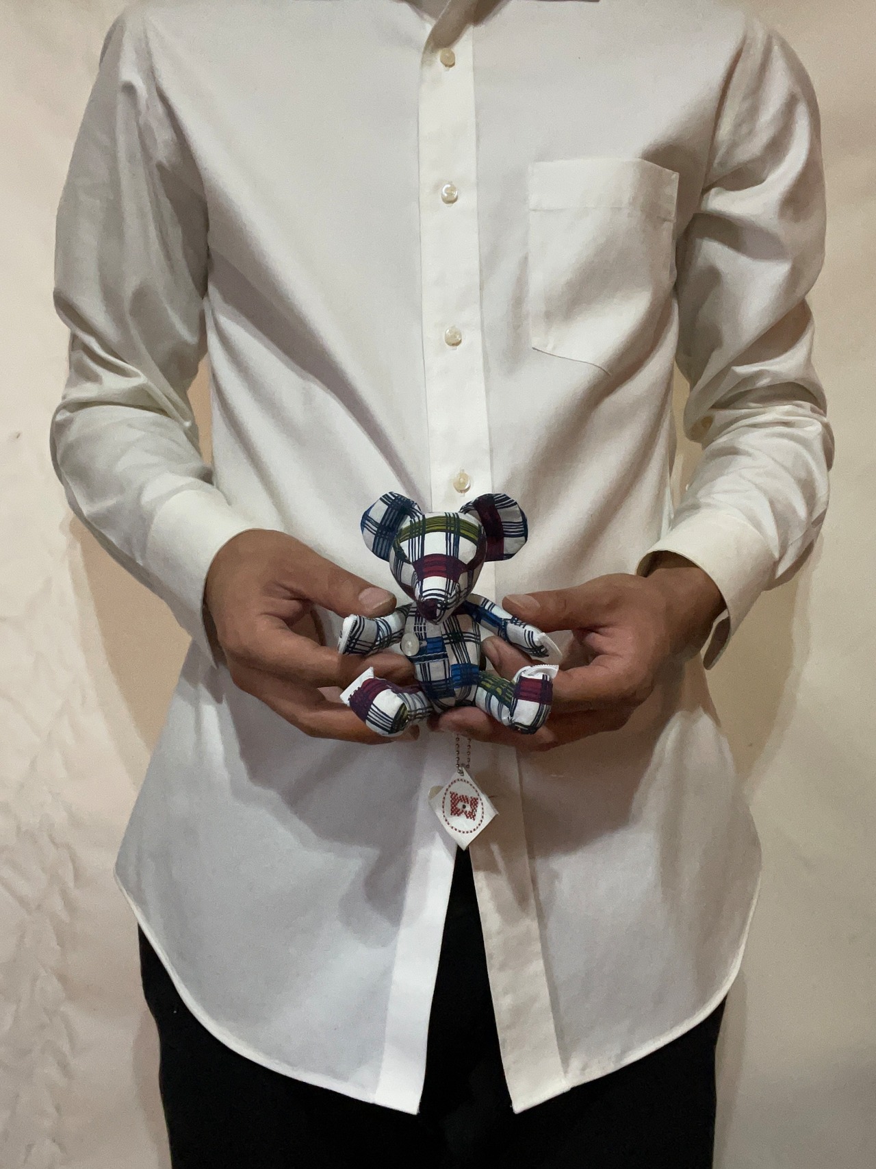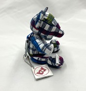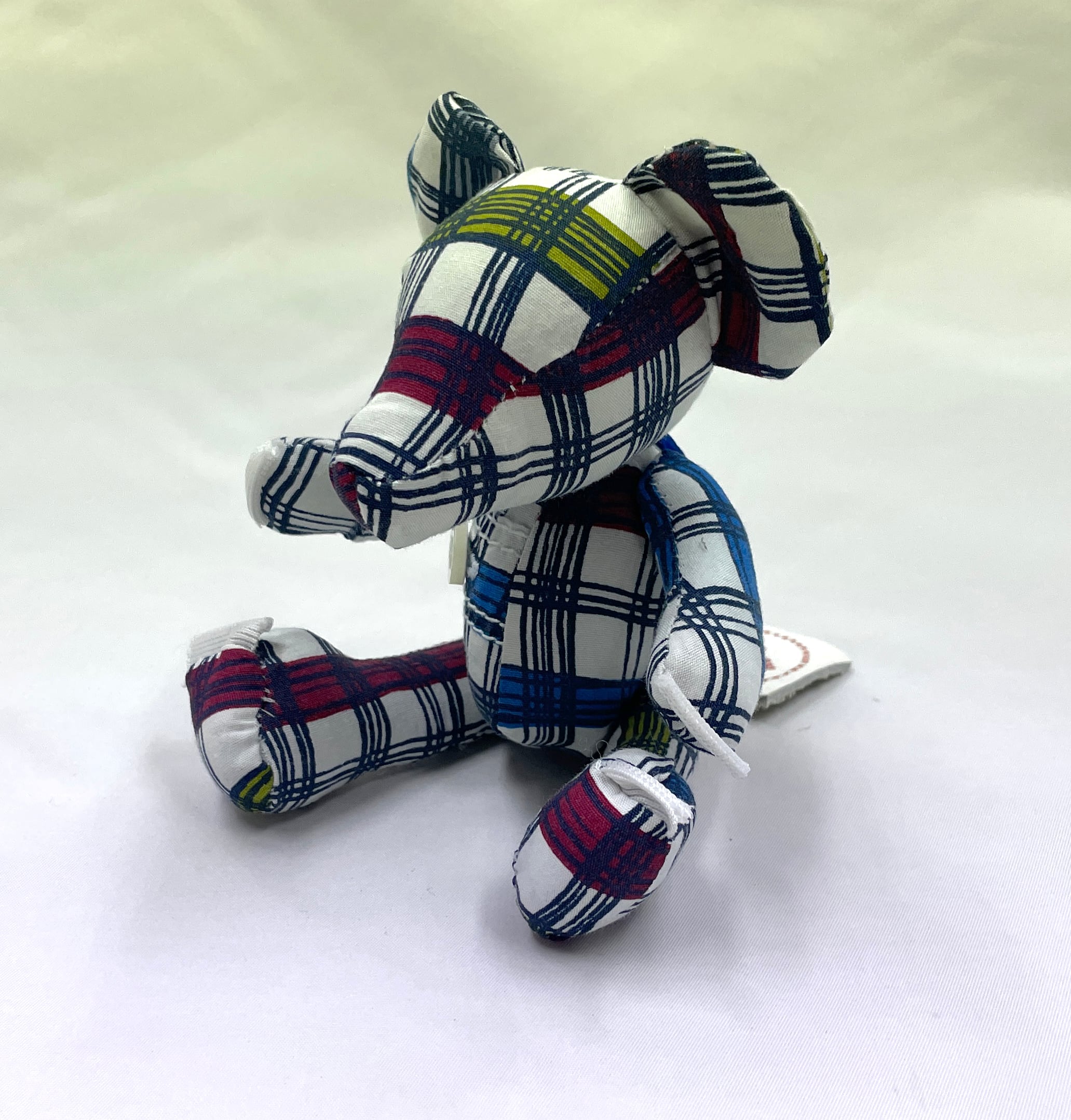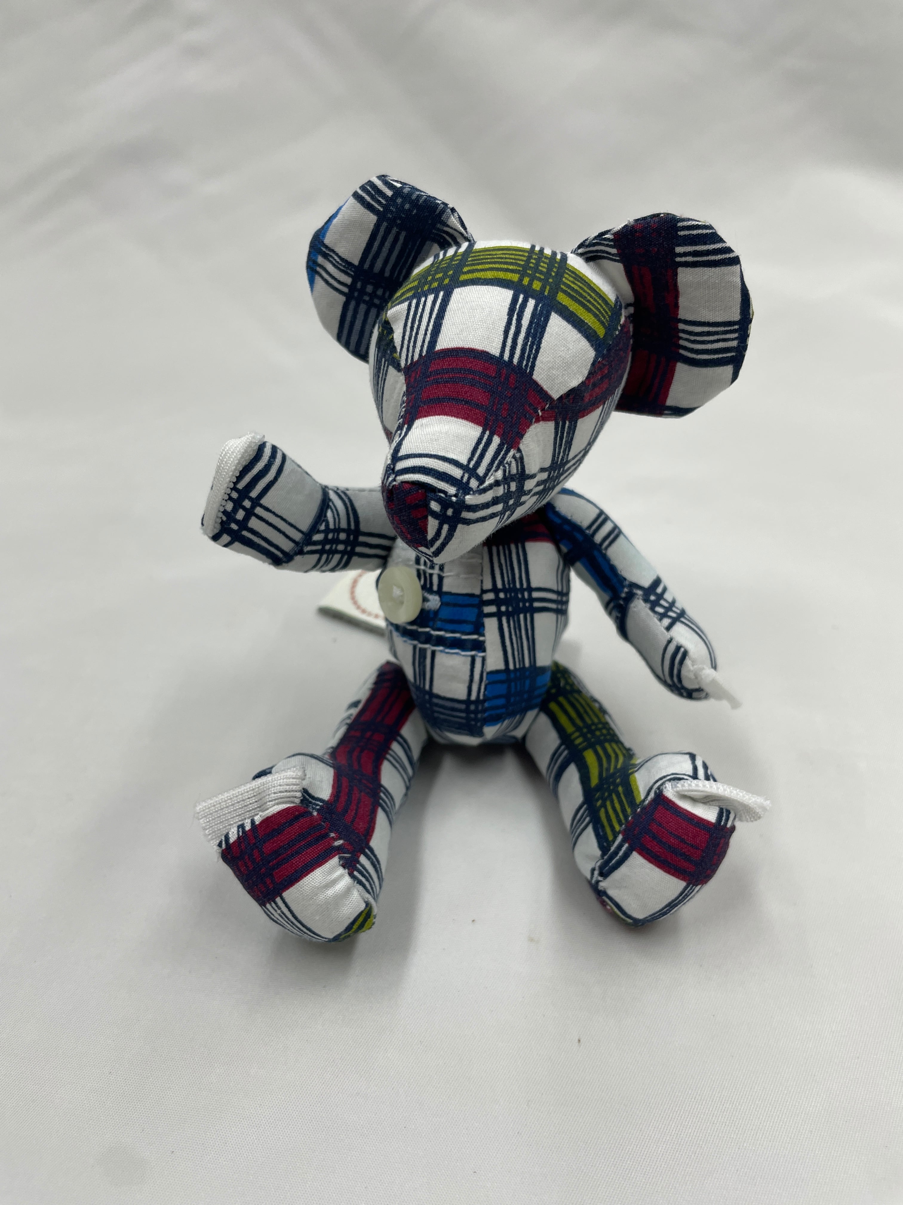 子供服のチェック柄シャツの生地を使用して作成した、ユニークなテディベアのキーホルダーです。