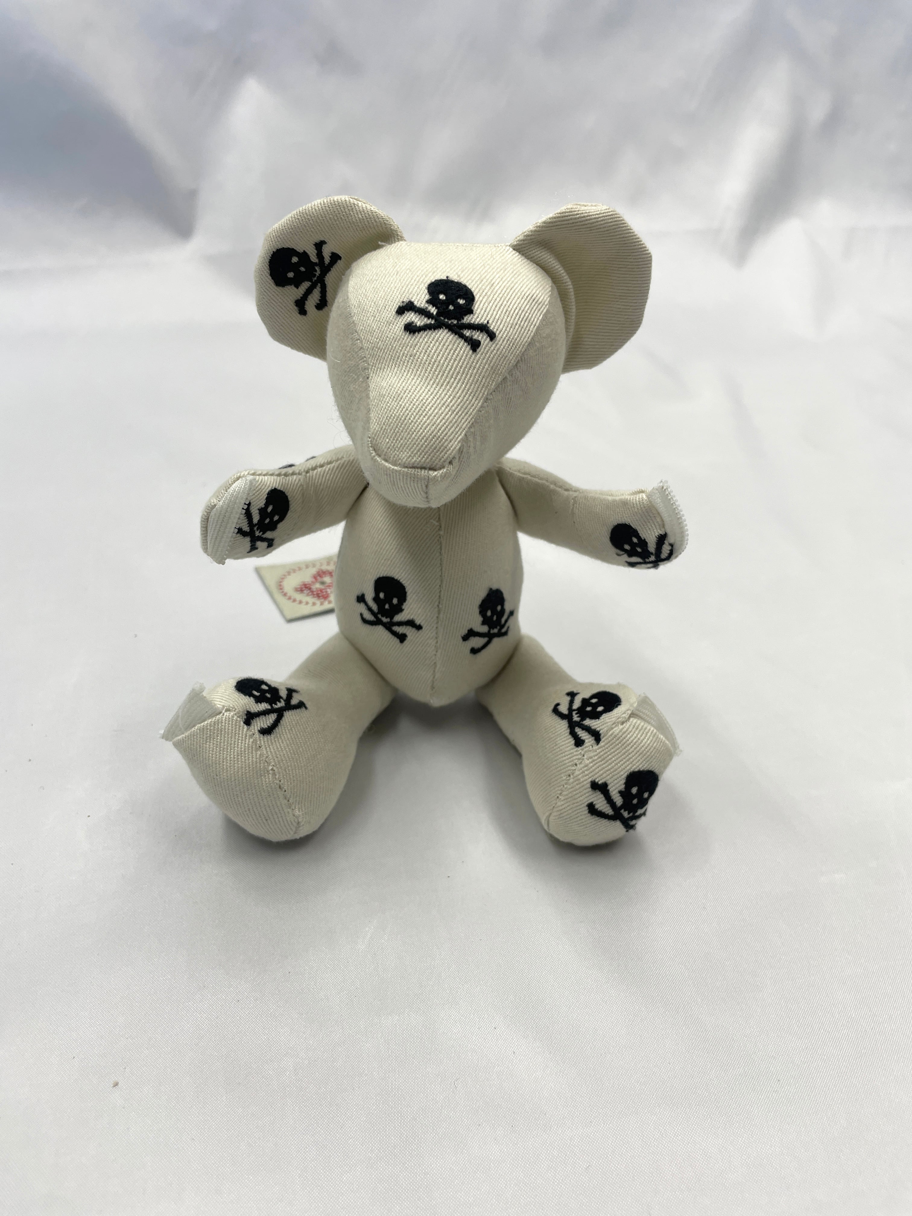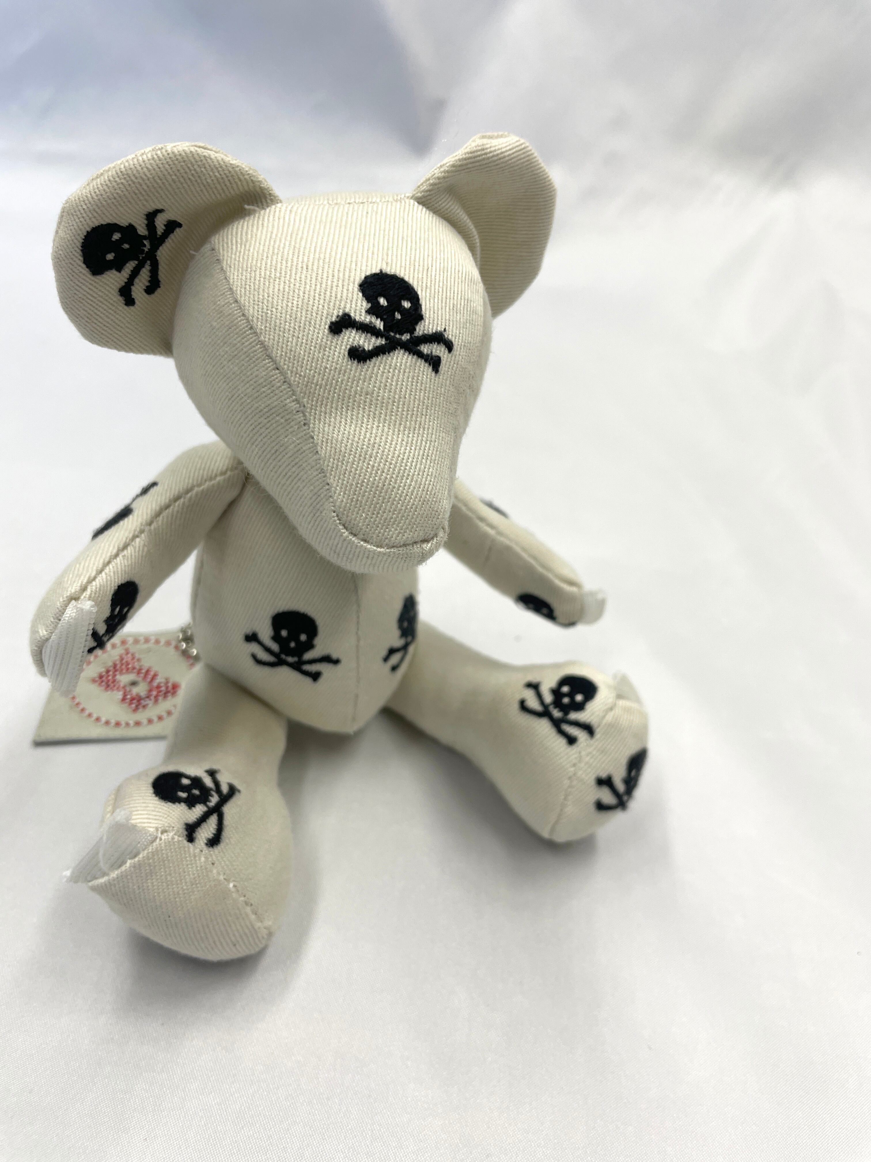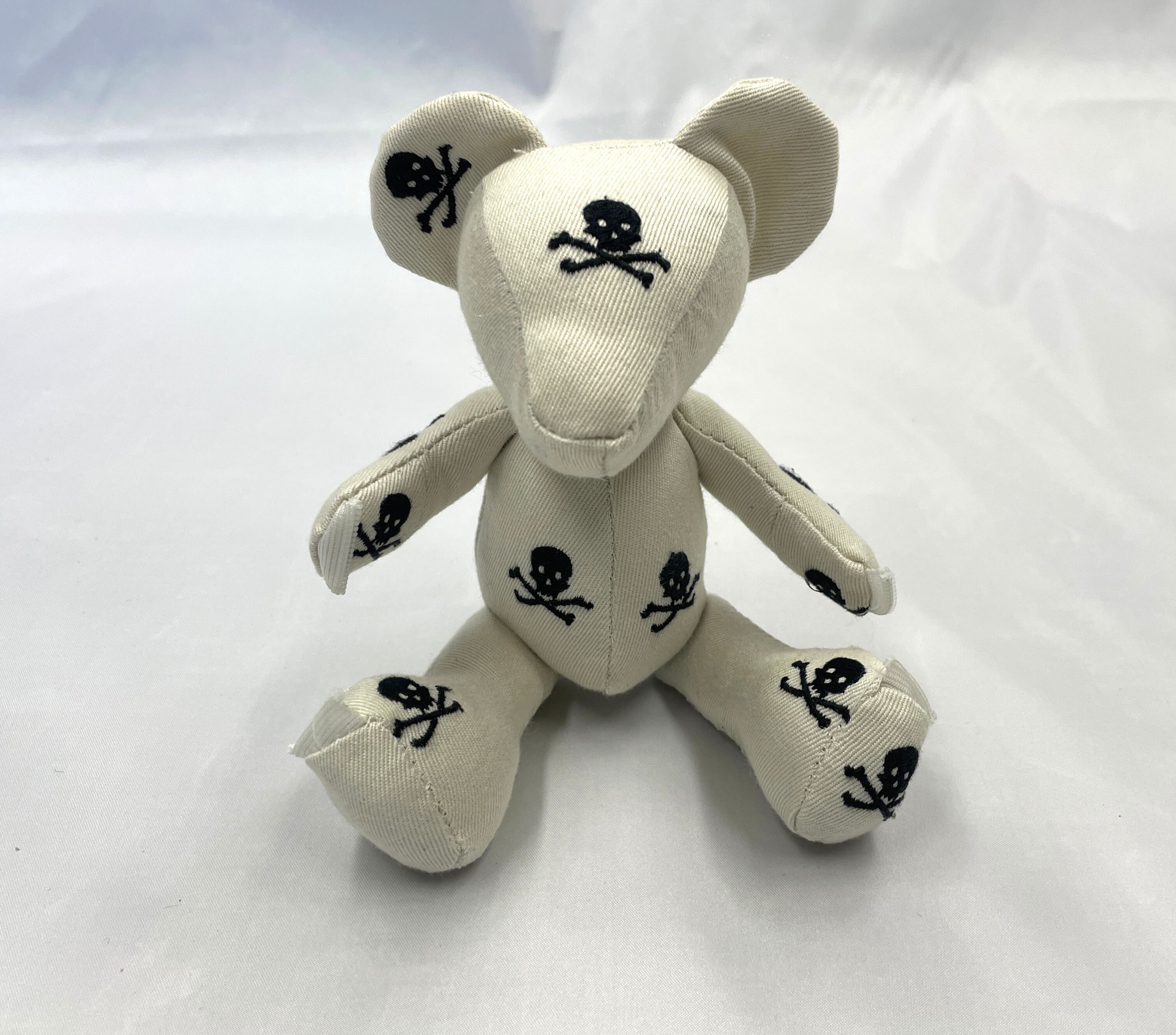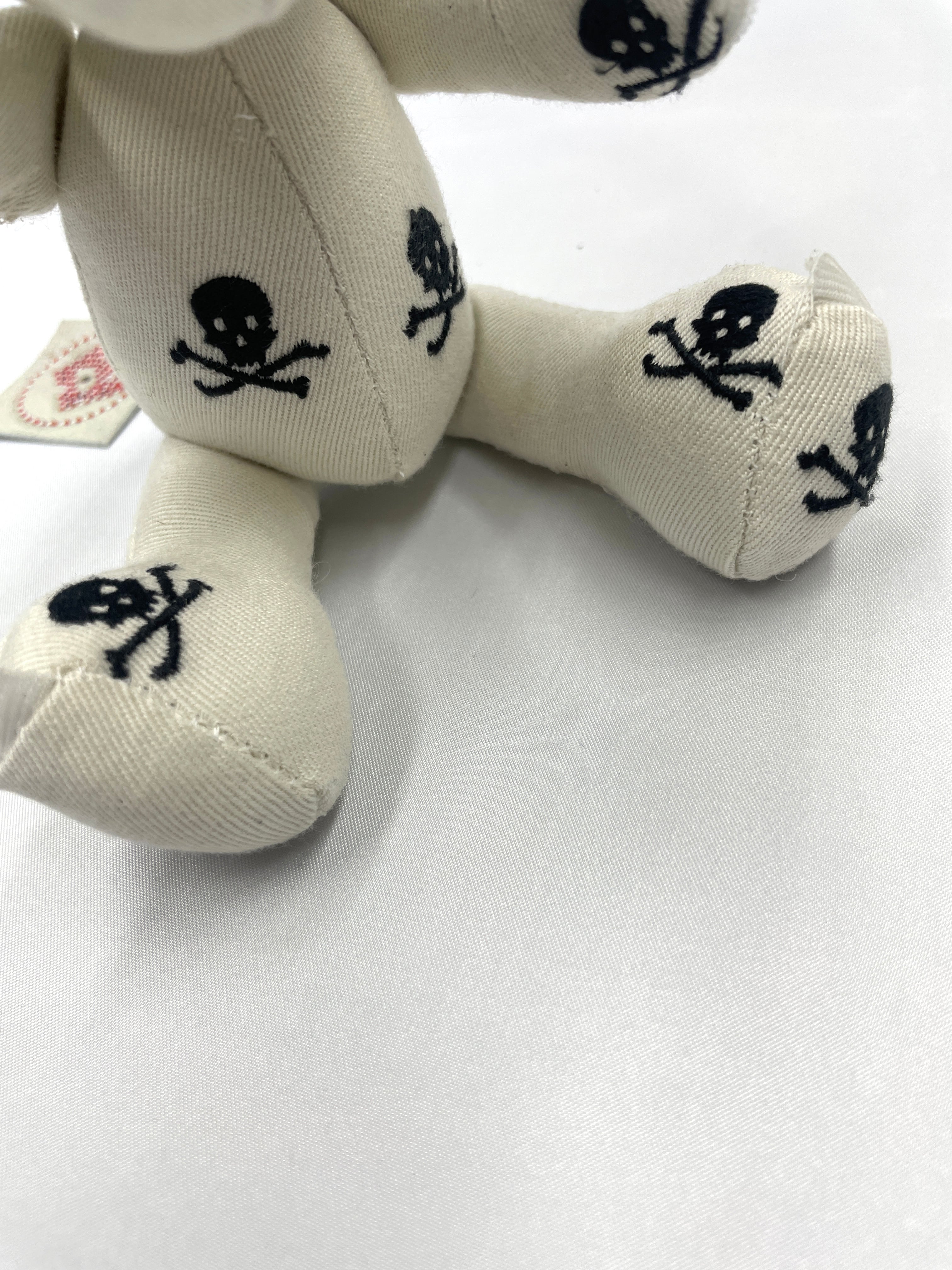 計算された配置: 小さなボディのどこから見てもドクロと目が合うよう、裁断からこだわって制作。可愛らしさとロックなパンク精神が共存する、大人にこそ似合う一匹です。