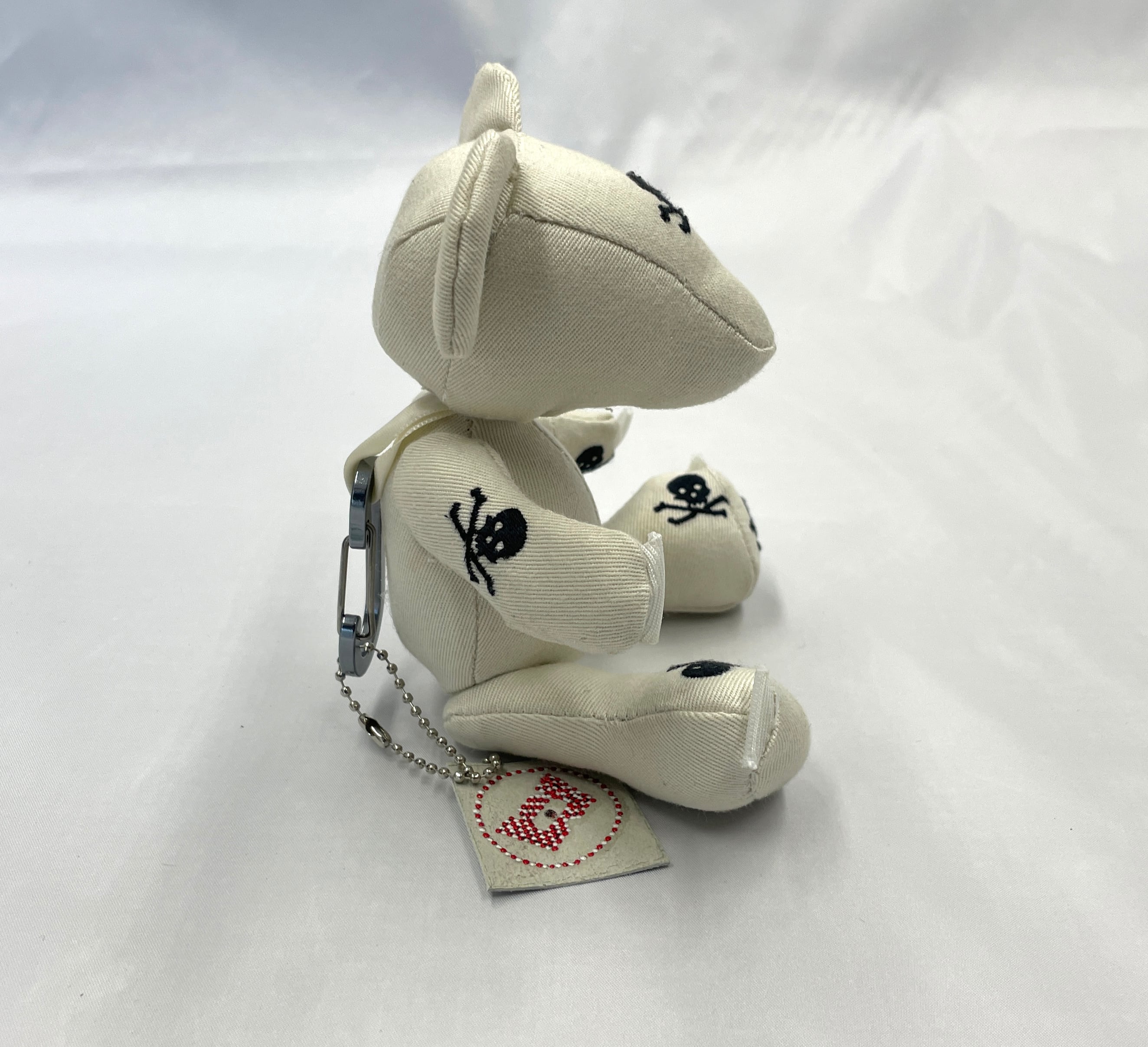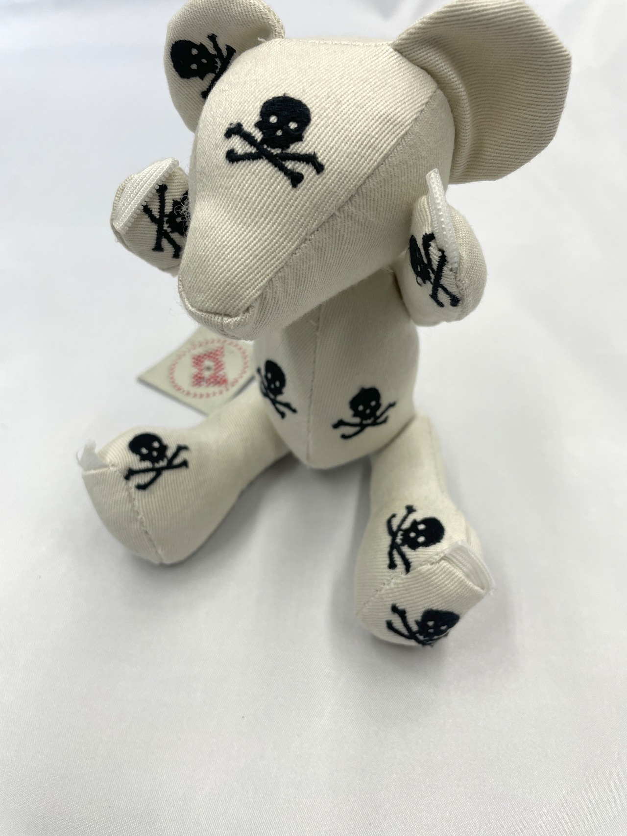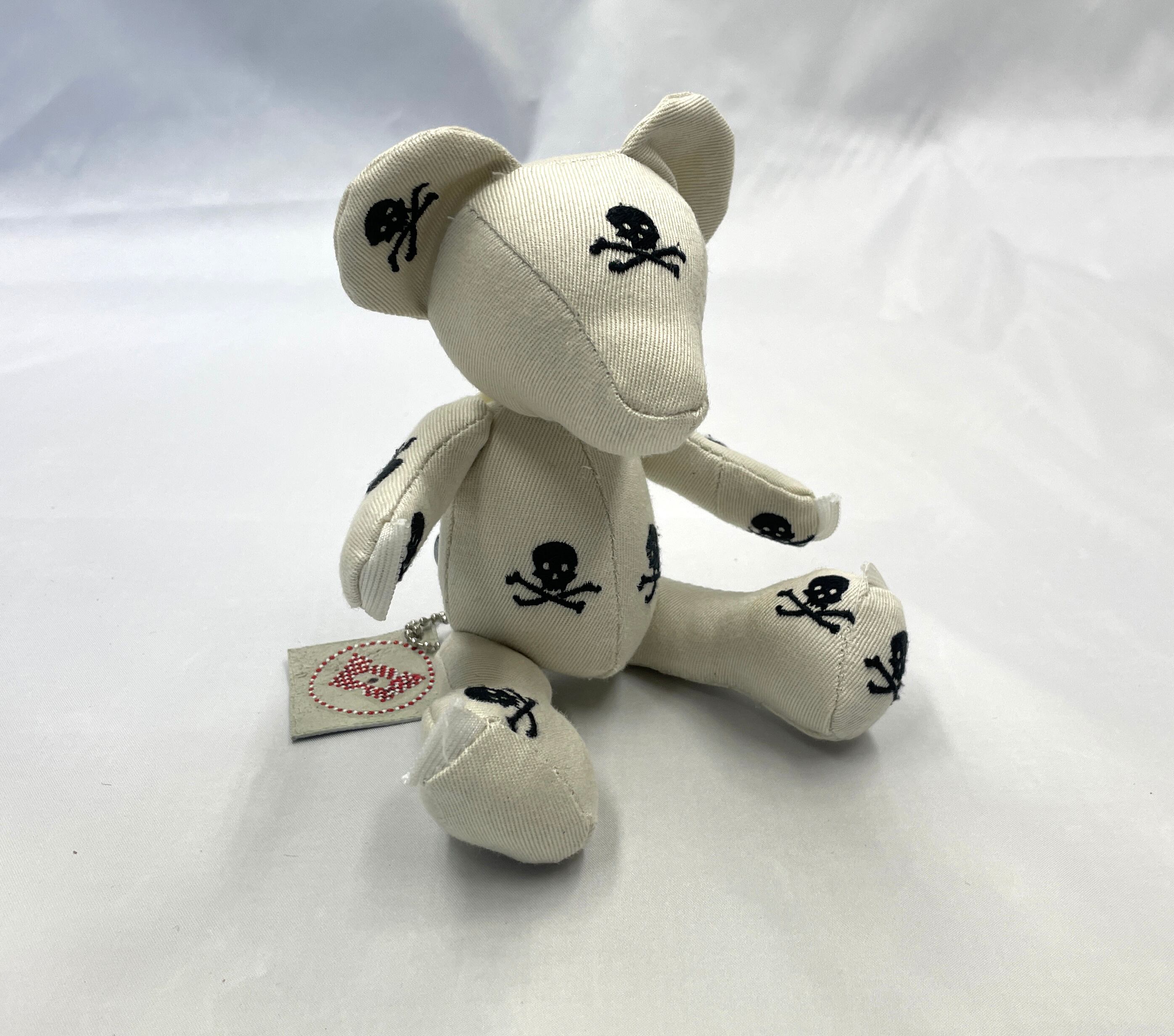 計算された配置: 小さなボディのどこから見てもドクロと目が合うよう、裁断からこだわって制作。可愛らしさとロックなパンク精神が共存する、大人にこそ似合う一匹です。