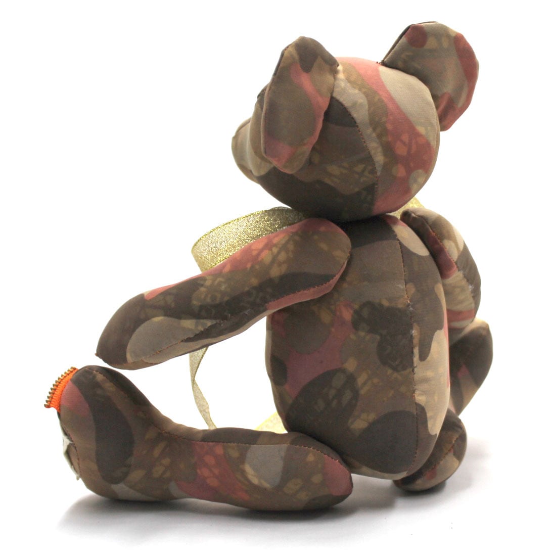 薄い迷彩柄のポリエステルとエスニック柄を重ね、カスタム生地を作り制作したオリジナルテディベアになります。