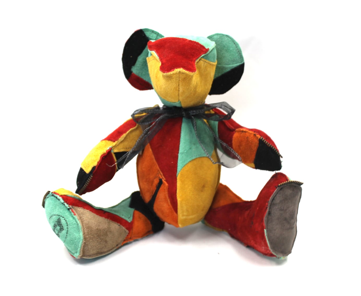 上質なレザースウェードの端切れを丁寧にパッチワークし、他に類を見ない、個性的なテディベアに仕立てました。
